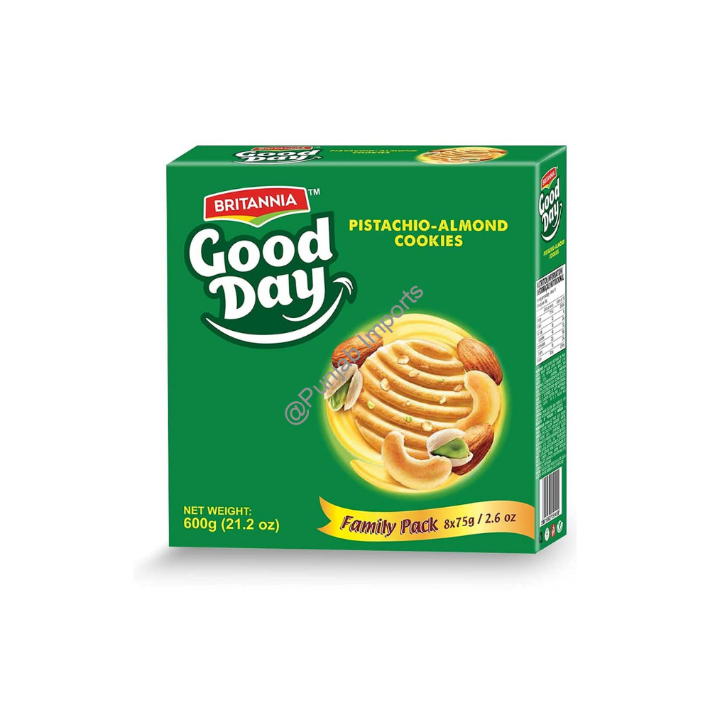 Good Day Pista-Almond Cookies – 648g, brought to you by Britannia, one of India’s most trusted and loved food brands. These cookies are an irresistible blend of real pistachios and almonds, baked into a golden, buttery cookie that’s perfect for every occasion from family tea times to festive gatherings.