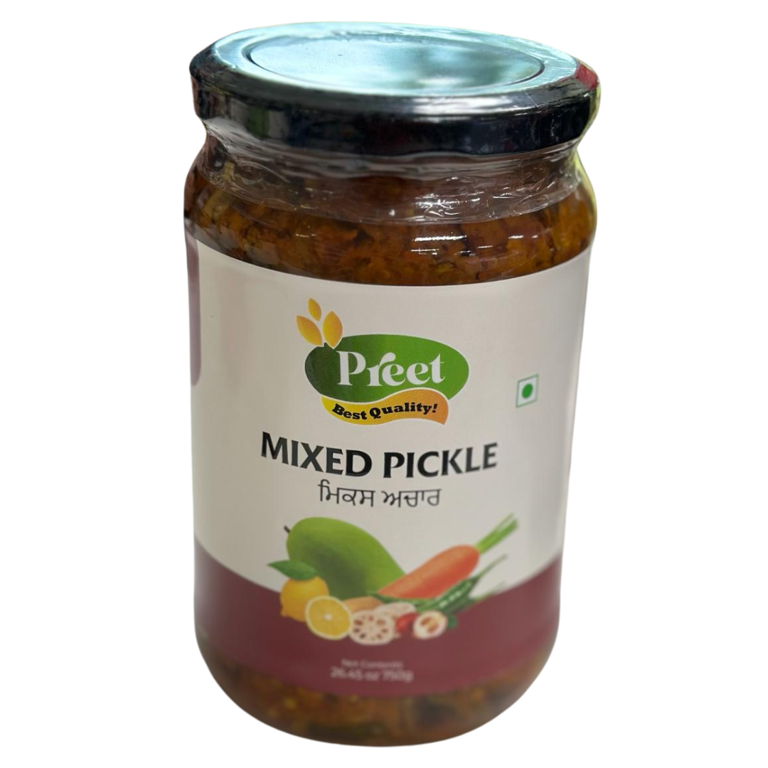 Preet Mixed Pickle (750 g) is a traditional, oil‑preserved South Asian condiment made by Preet Pickles (Punjab, India). This mixed vegetable pickle combines a zesty assortment—typically raw mango, lime, carrot, green chili, and occasional cauliflower or ginger—marinated in flavorful mustard/cottonseed oil and Punjabi spice blends. Its 750 g jar offers excellent value and is ideal for food lovers who enjoy bold, tangy pickles alongside daily meals.